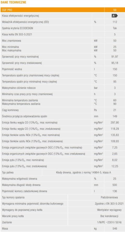 CGF PRO to ekologiczne kotły stalowe zgazowujące drewno. Urządzenia wykorzystują proces zgazowania drewna – termiczny rozkład drewna przy znacznym niedomiarze powietrza, w którym powstaje palny gaz drzewny i popiół. CGF PRO wykorzystują energię zawartą w paliwie z dużo większą sprawnością niż urządzenia tradycyjne i charakteryzują się niską emisją substancji lotnych porównywalną do kotłów gazowych. Są to to jedne z najbardziej wydajnych kotłów w swojej klasie, a ich sprawność wynosi 94-95%. Urządzenia wyróżniają się wysoką autonomią pracy oraz dużą pojemnością wodną i dużą pojemnością załadunkową umożliwiającą wykorzystanie polan drewna o długości do 50 cm. CGF PRO to oszczędne i przyjazne środowisku źródło ciepła, doskonałe do wykorzystania w obiektach indywidualnych oraz komercyjnych.