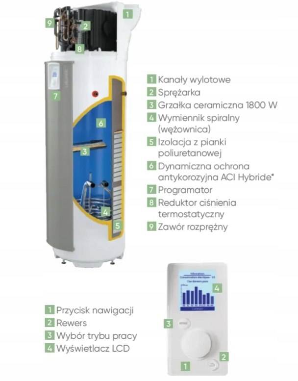 • 80% tańszy w eksploatacji od klasycznego ogrzewacza elektrycznego o tej samej pojemności